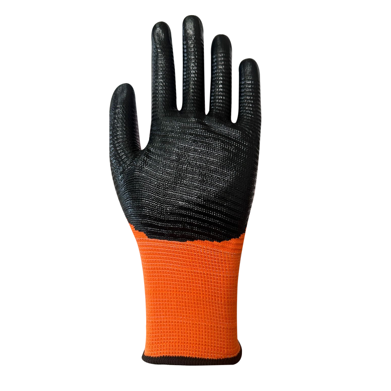Guante con hilado de poliéster, recubierto con nitrilo rugoso en la palma, permitiendo un mayor agarre en trabajo de manipulación de herramientas y maquinarias.